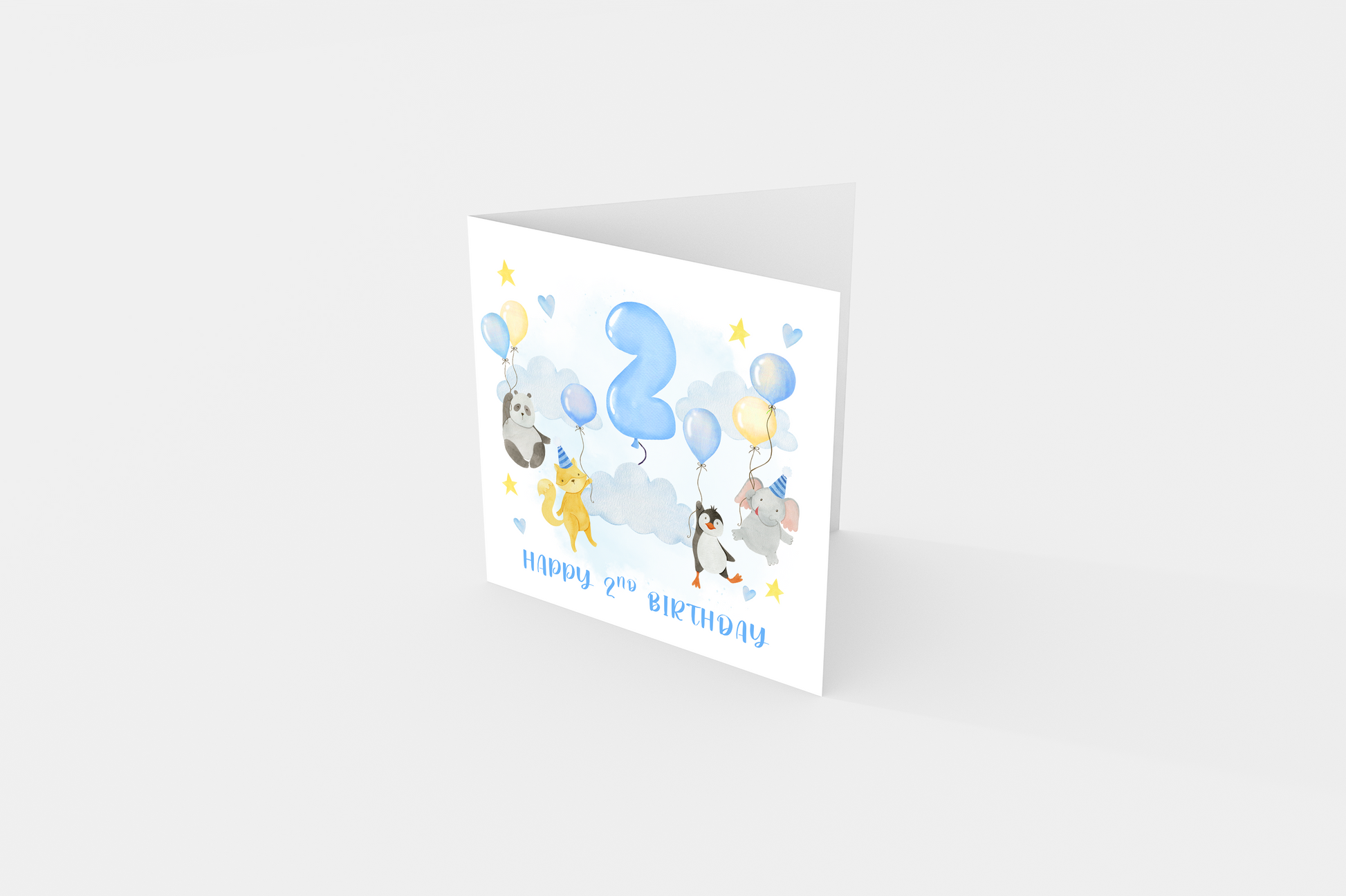 Celebrate a little one’s special milestone with this adorable 2nd birthday card, perfect for boys! Featuring a charming watercolor design of a panda, fox, penguin, and elephant holding balloons around a big blue number “2,” this card brings a joyful and whimsical touch to any celebration.