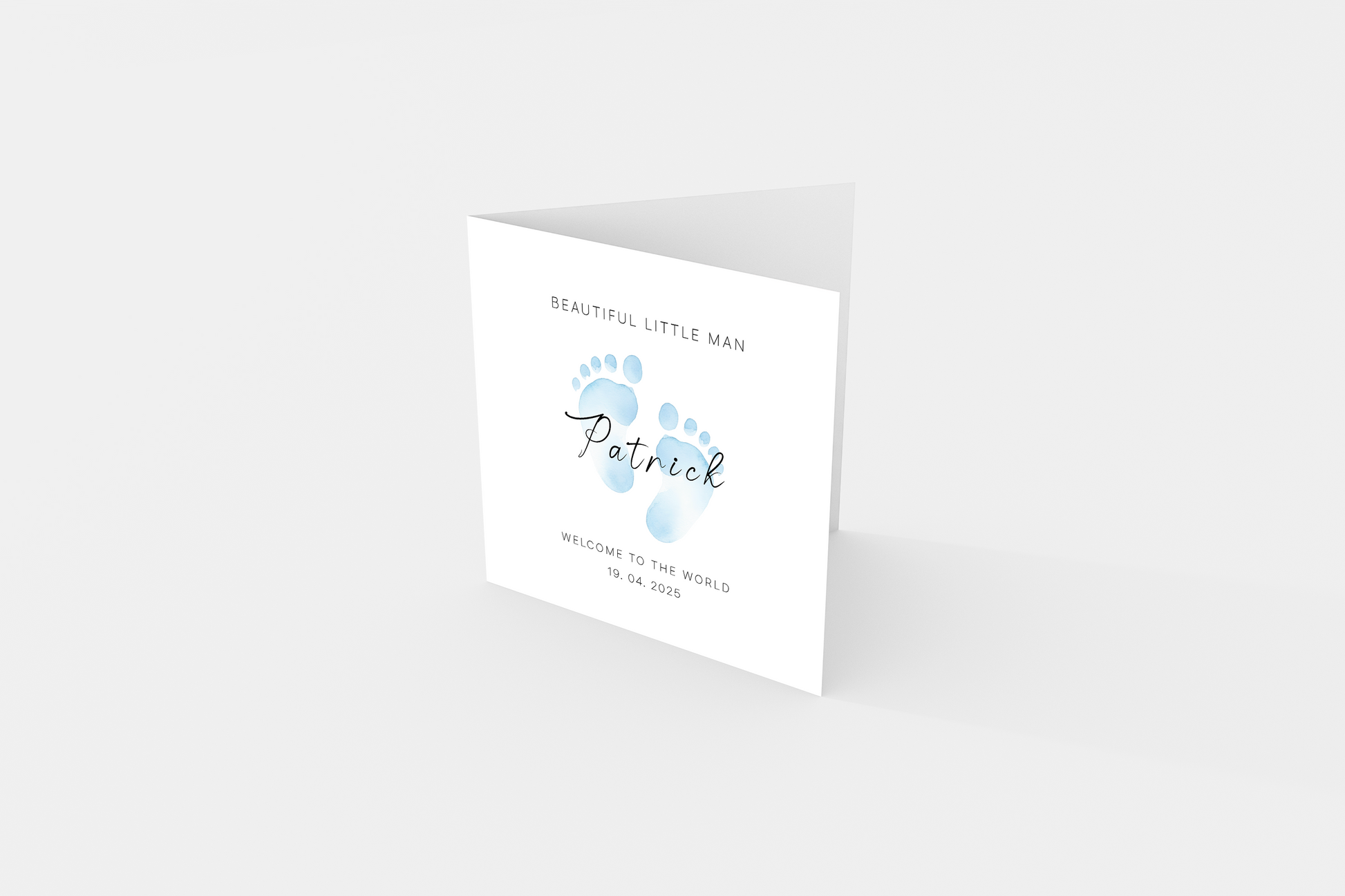 Celebrate the arrival of a precious little boy with this beautifully designed personalised new baby card. Featuring soft blue baby footprints and elegant typography, this card makes a timeless keepsake for new parents.