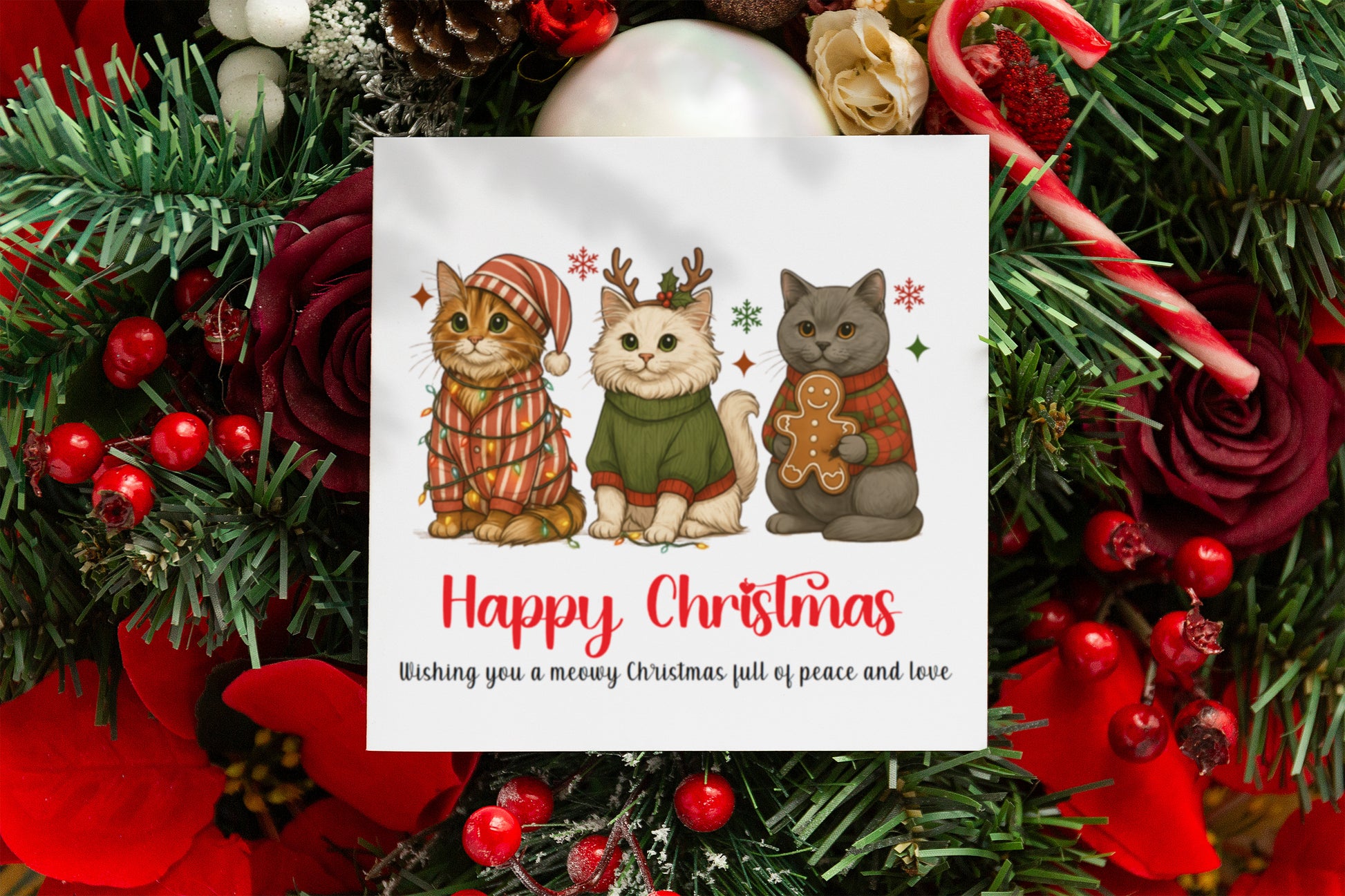 🐾 Celebrate the festive season with this adorable Meowy Christmas card featuring three cute cats dressed in their holiday best! Wrapped in twinkling lights, cozy sweaters, and Christmas cheer, this charming greeting card is the perfect way to spread joy, peace, and love. Whether you’re sending warm wishes to family, friends, or fellow cat lovers, this high-quality card is sure to bring smiles. Comes with a vibrant red envelope and plenty of space inside for your personal message.