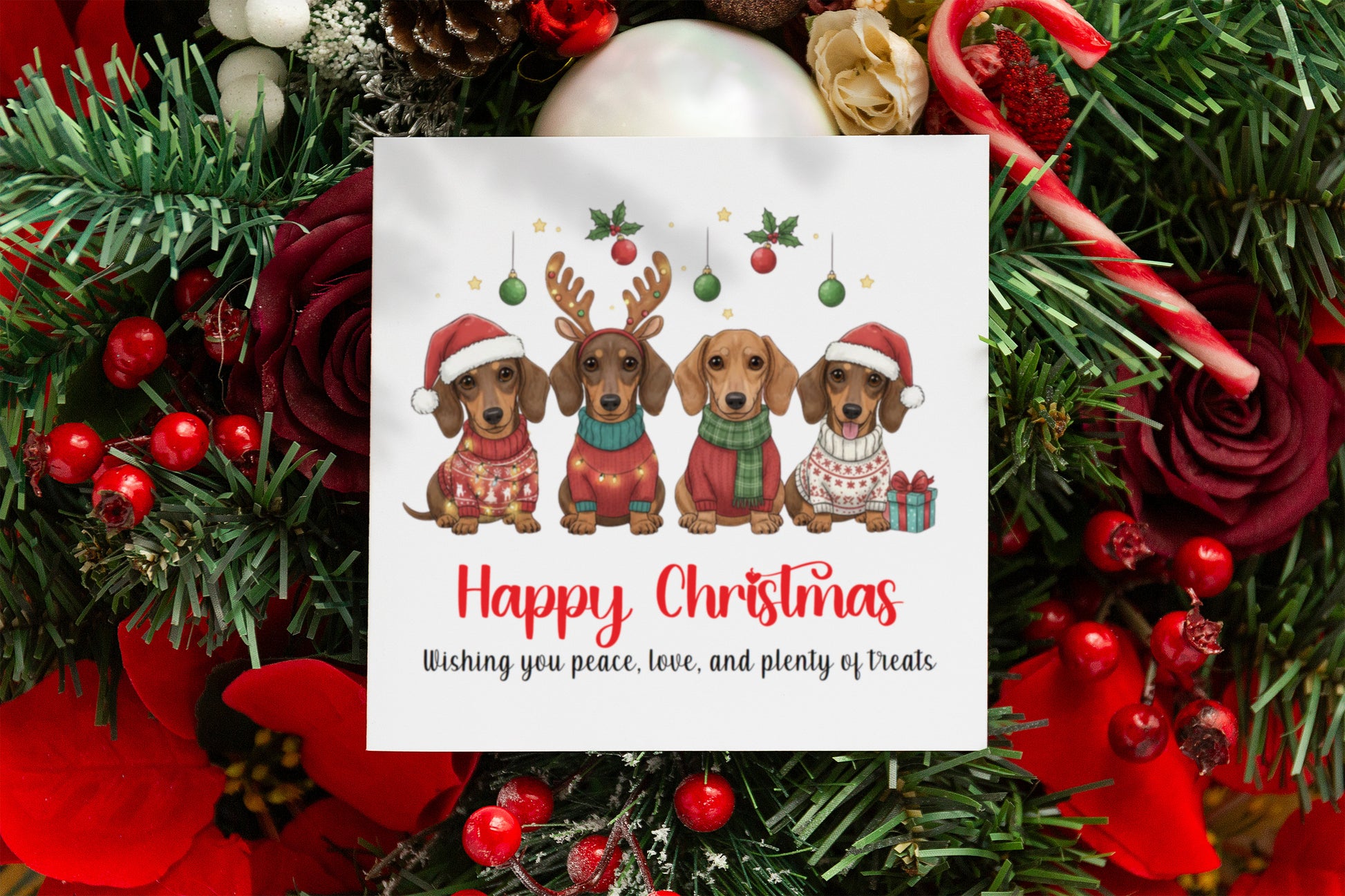 πΎ Celebrate the festive season with this adorable Happy Christmas card featuring four charming dachshunds dressed in cozy holiday sweaters! Perfect for dog lovers, friends, and family, this cute Christmas greeting card is sure to bring smiles and festive cheer.