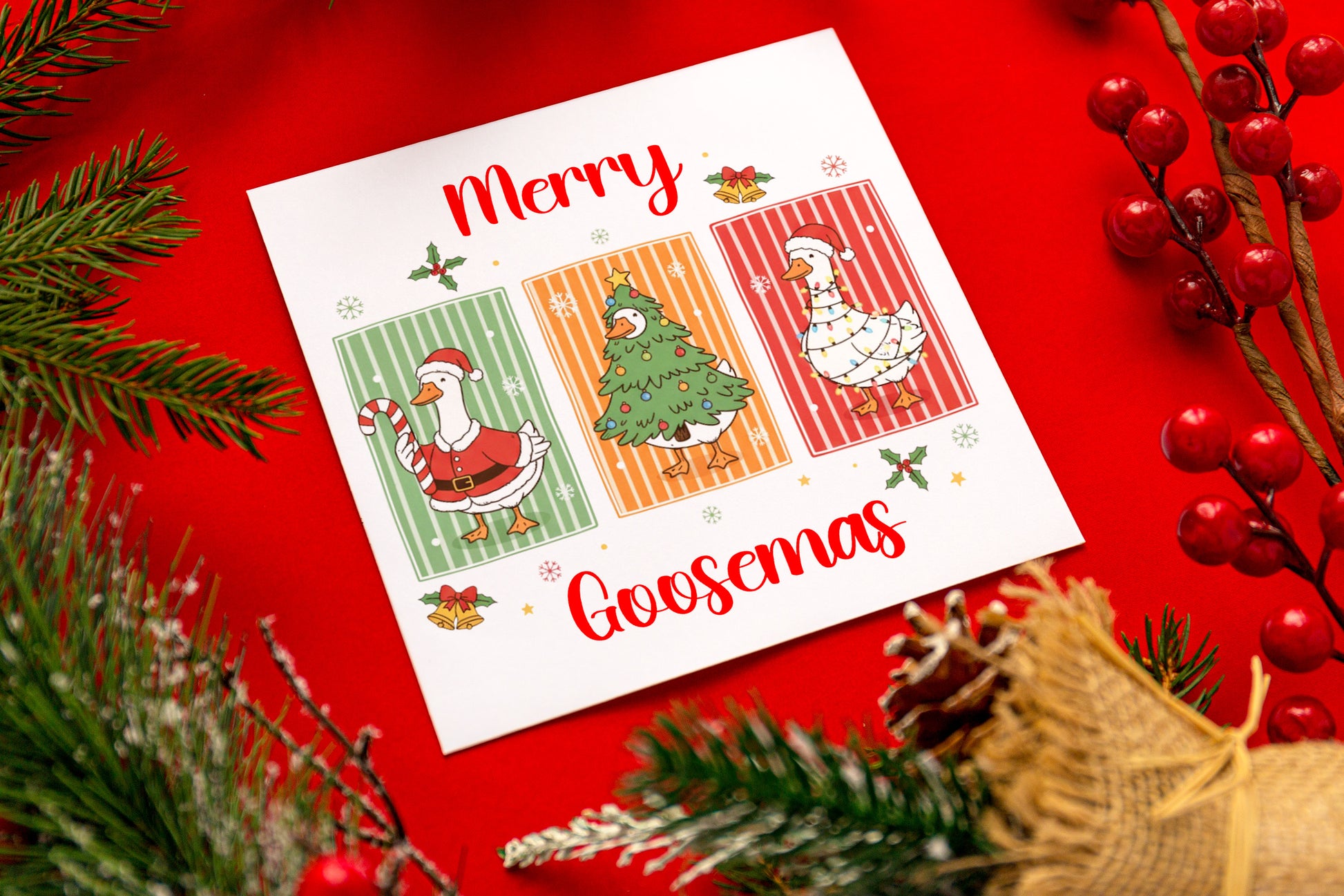 🪿🎄✨Celebrate the festive season with a smile! This Merry Goosemas Christmas card features three charming geese dressed in holiday costumes — Santa goose, Christmas tree goose, and fairy light goose — sure to bring joy and laughter to anyone who receives it.