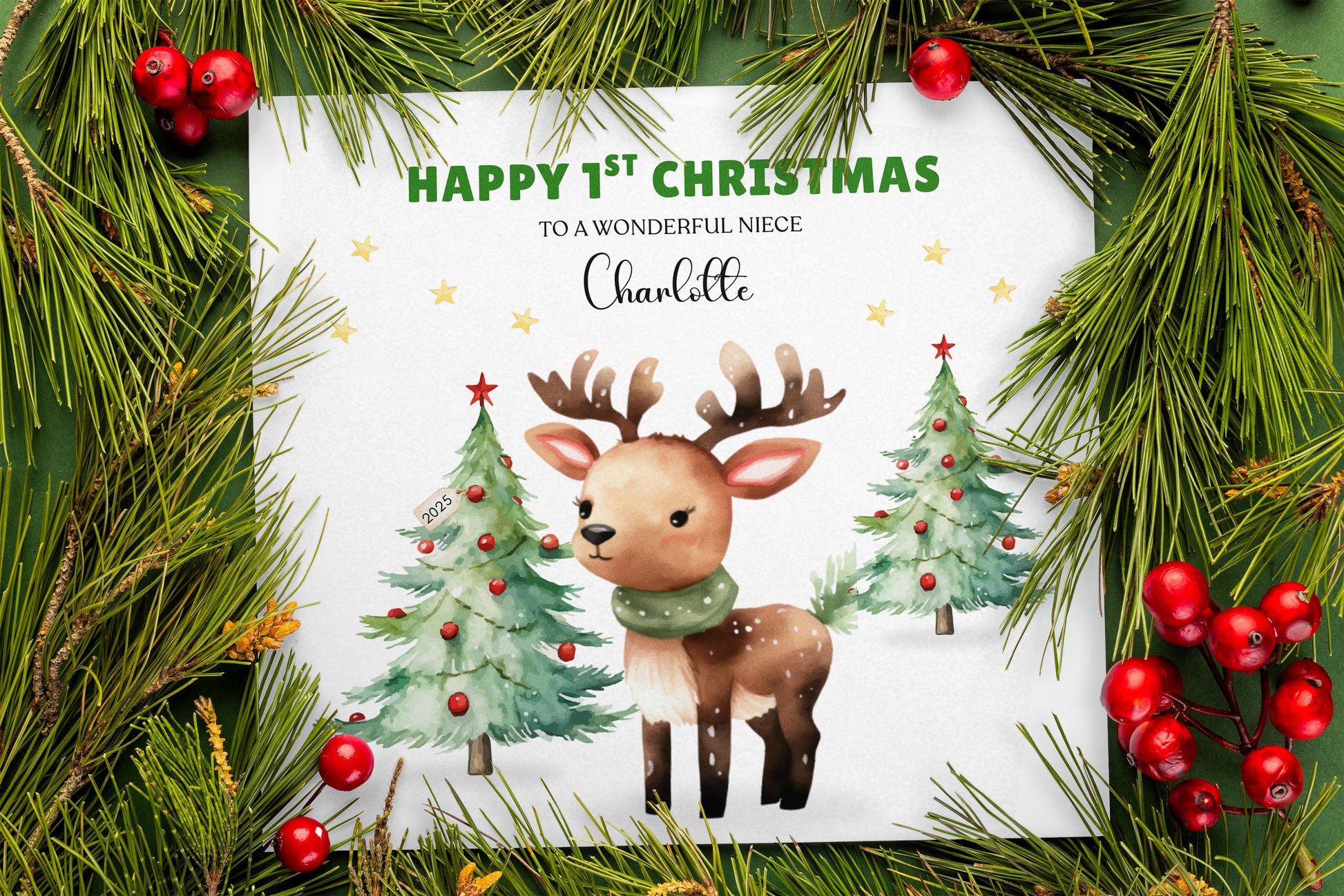 🎄 Celebrate a magical Christmas milestone with this beautifully personalised card for a baby girl’s 1st, 2nd, 3rd or any early Christmas. Featuring an adorable reindeer in a festive winter scene, this card makes a thoughtful keepsake to treasure forever.