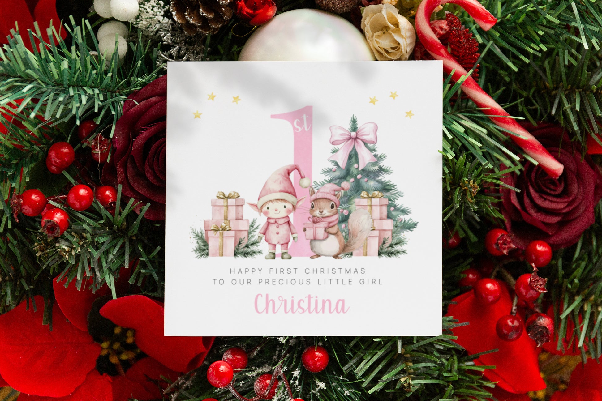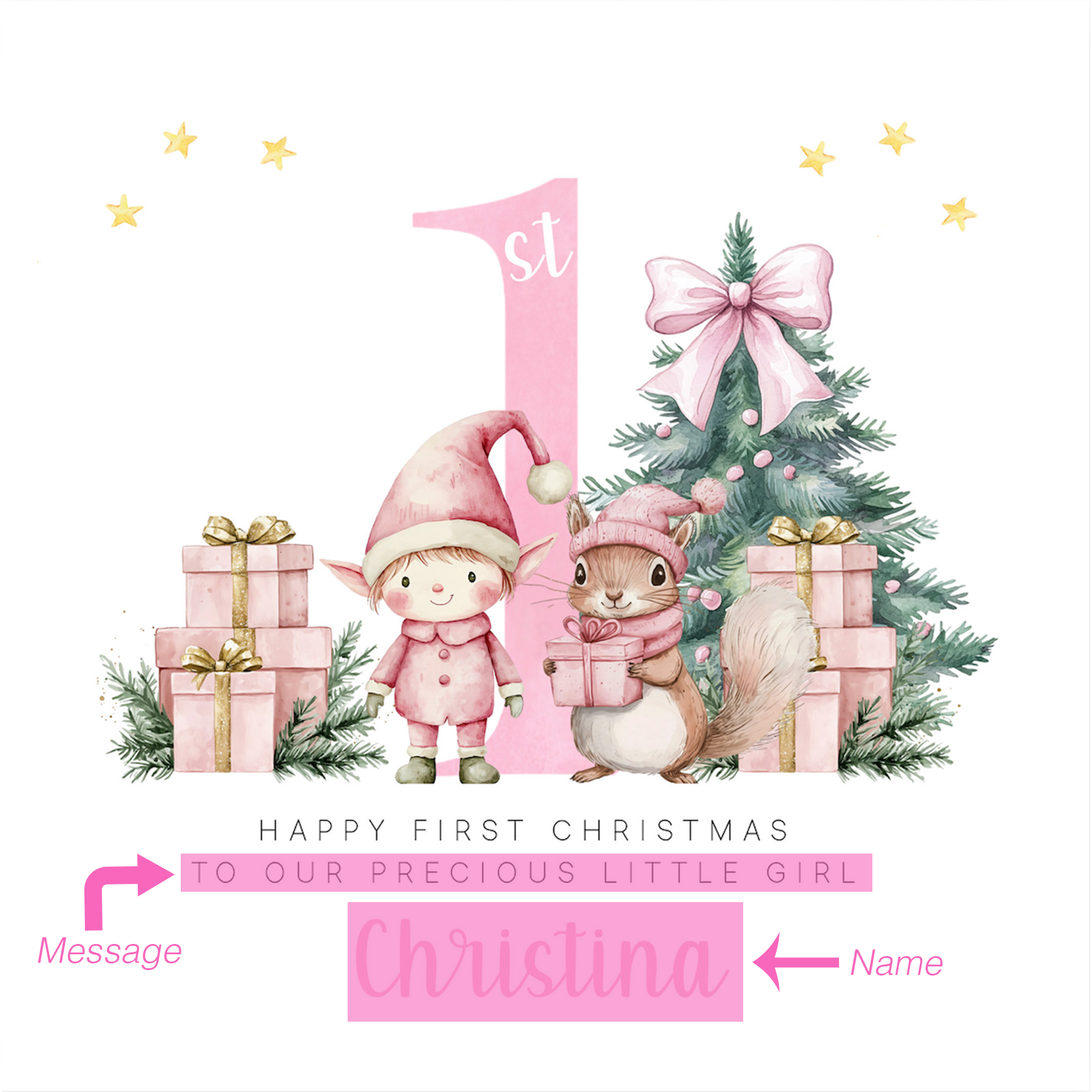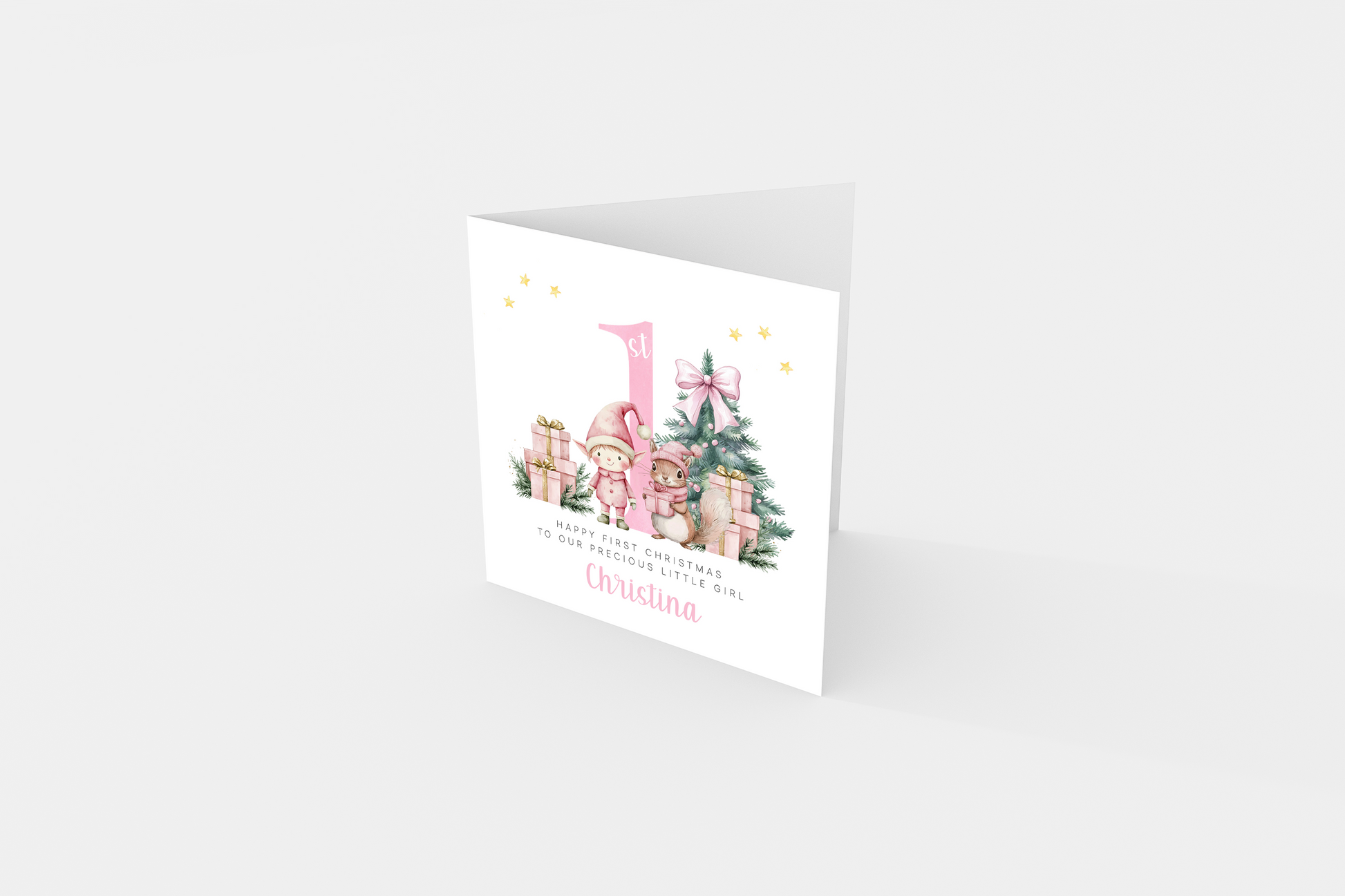 Celebrate her very first Christmas with a beautifully personalised pink Christmas card — the perfect keepsake for a special little girl. Featuring an adorable festive scene with a cute elf, squirrel, Christmas tree, and pink presents, this charming design makes a truly heartfelt gift.