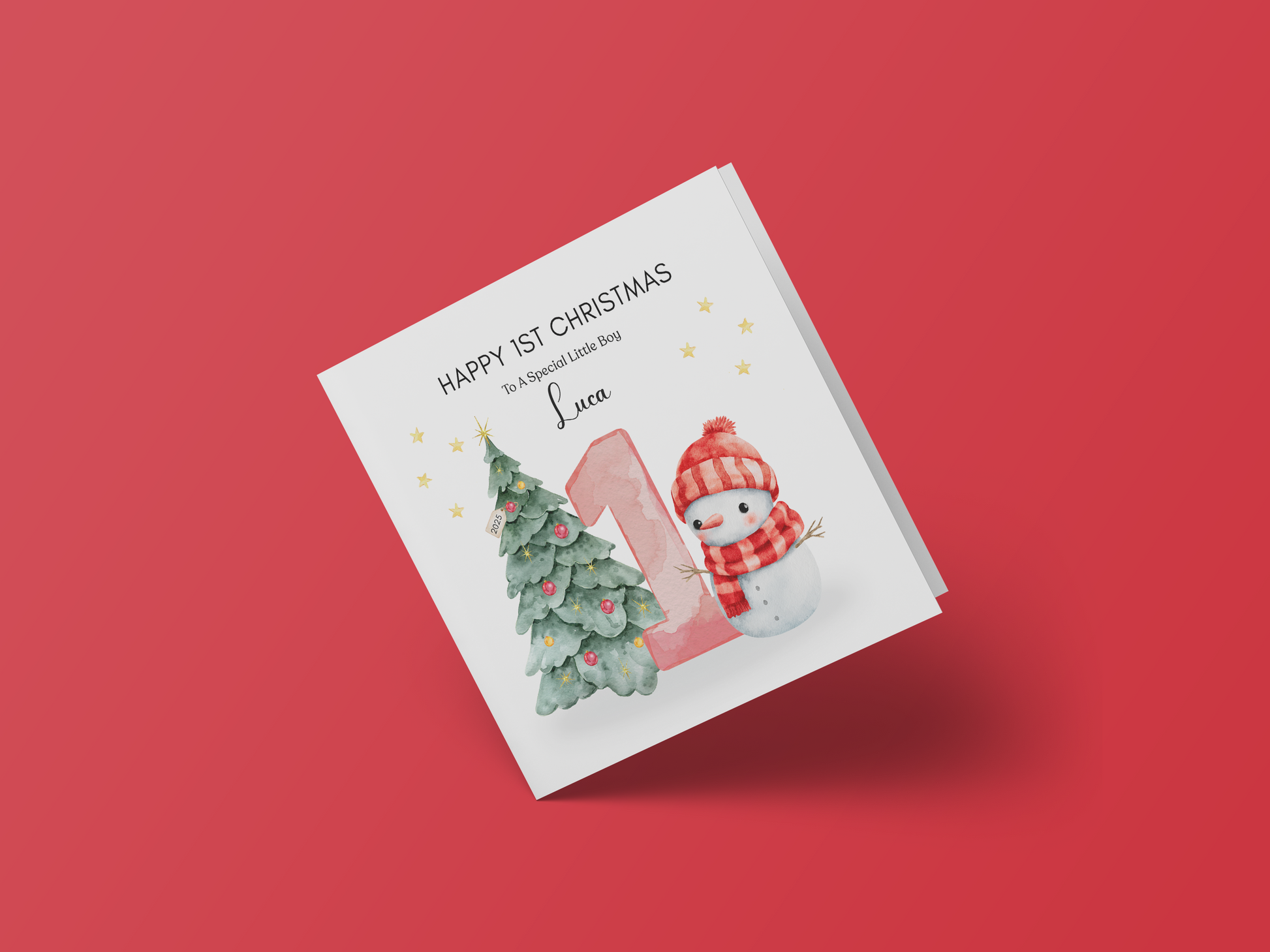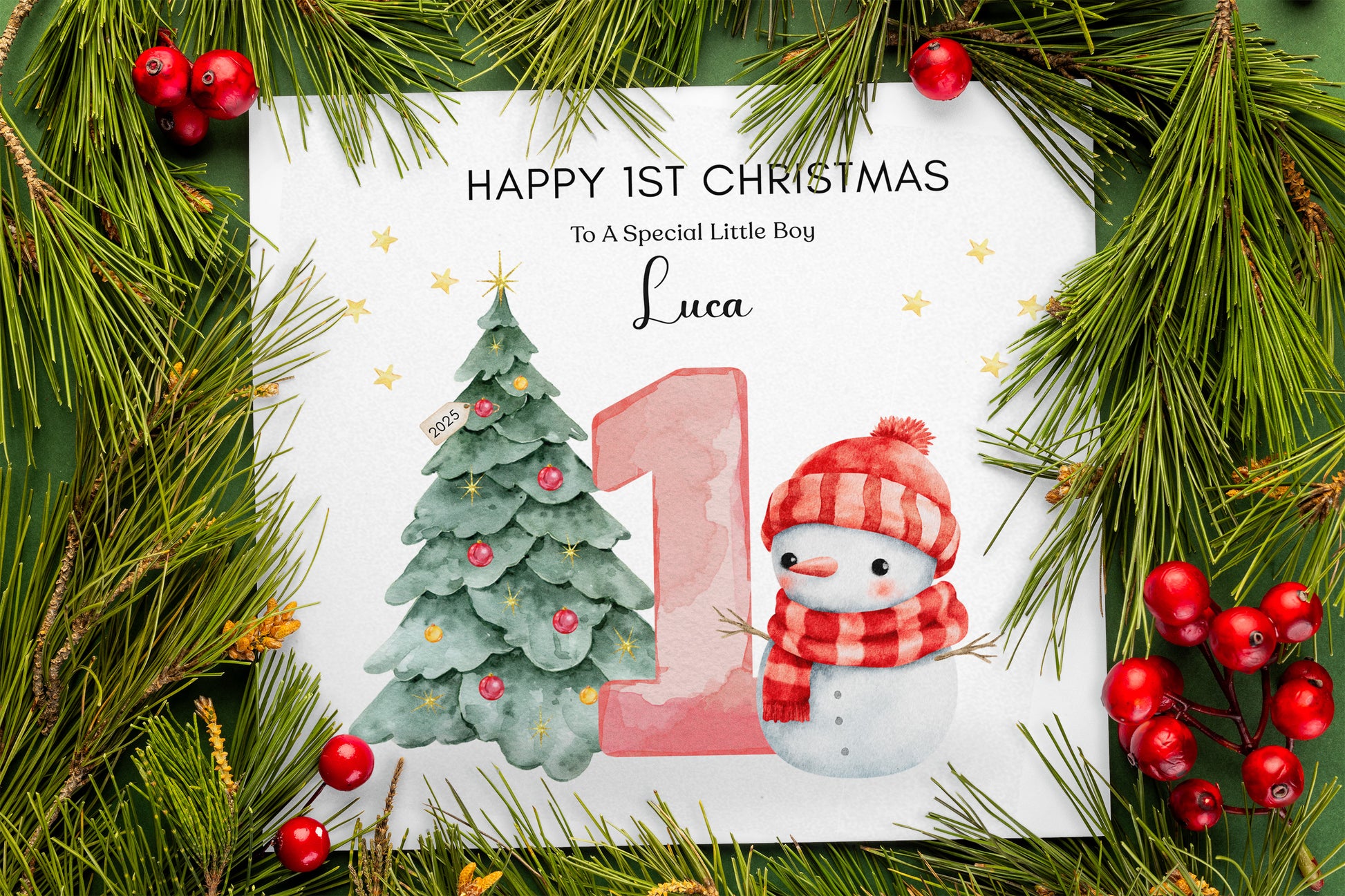 🎄 Celebrate the magic of Baby’s First Christmas 2025 with this beautifully personalised greeting card, custom printed with your baby’s name & message. Featuring an illustrated snowman in a cosy red hat and scarf, a decorated Christmas tree, and a bold festive red number “1,” this keepsake card is perfect for marking such a special milestone.
