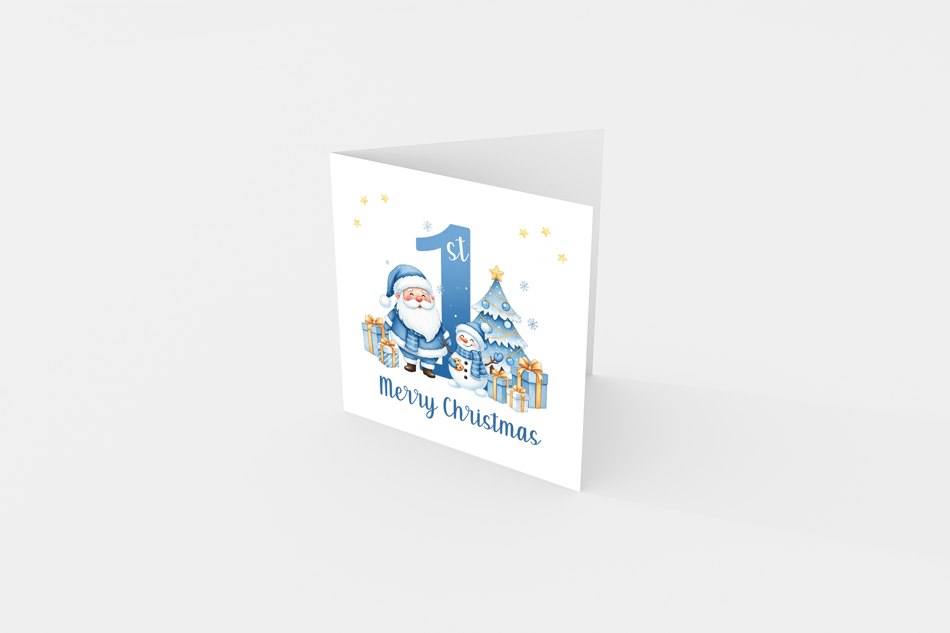 🎄 Celebrate a magical milestone with this Baby Boy’s First Christmas Card, featuring a heartwarming blue design with Santa, a snowman, presents, and a festive tree. Designed especially for boys, this charming card says "Merry Christmas"at the bottom, making it a lovely, ready-to-send greeting for a baby’s 1st festive season.