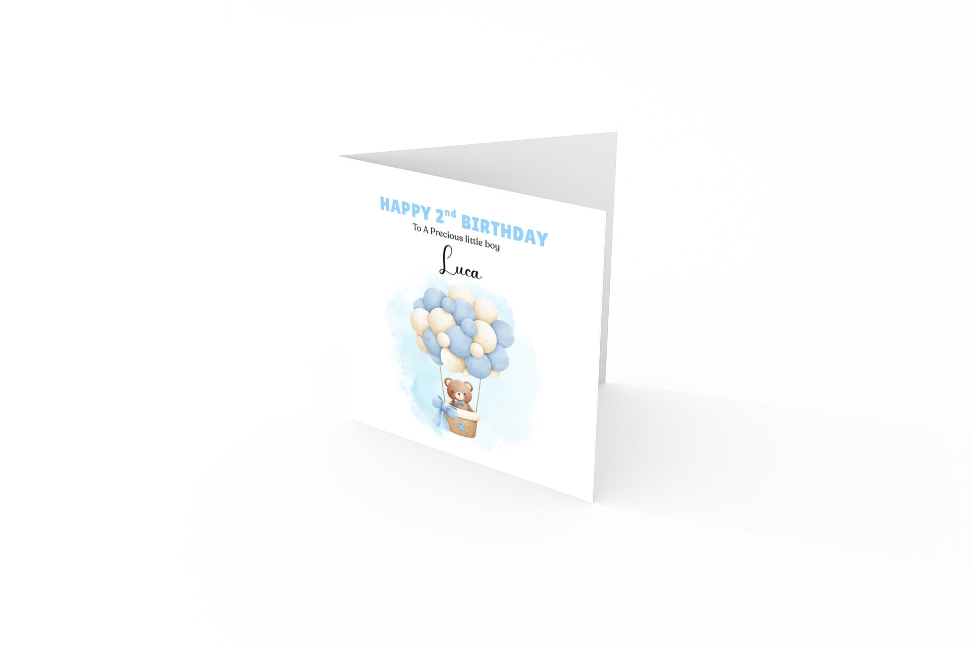 Celebrate your little boy’s special day with this adorable personalised 2nd birthday card! Featuring a sweet teddy bear floating in a hot air balloon made of blue and cream balloons, this charming design perfectly captures the joy and innocence of turning two.