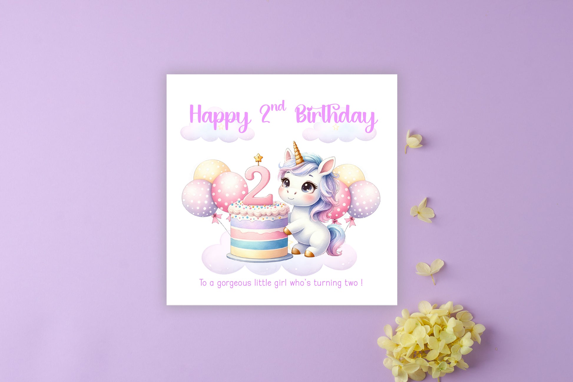 Celebrate her special day with this beautiful unicorn 2nd birthday card for girls! Featuring an adorable unicorn sitting beside a pastel birthday cake and colourful balloons, this sweet and magical design is perfect for little girls who love all things sparkly and cute.