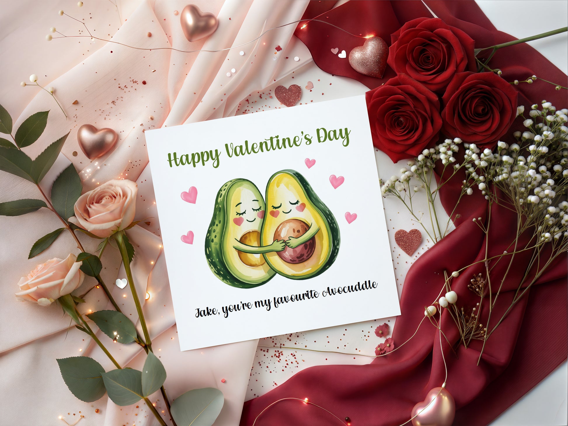 Personalised Happy Valentine’s Day Card with Cute Avocados Design for Loved Ones, Wife, Husband, Boyfriend, Girlfriend, Partner etc - Custom Name for Him or Her - Pink Envelope Included