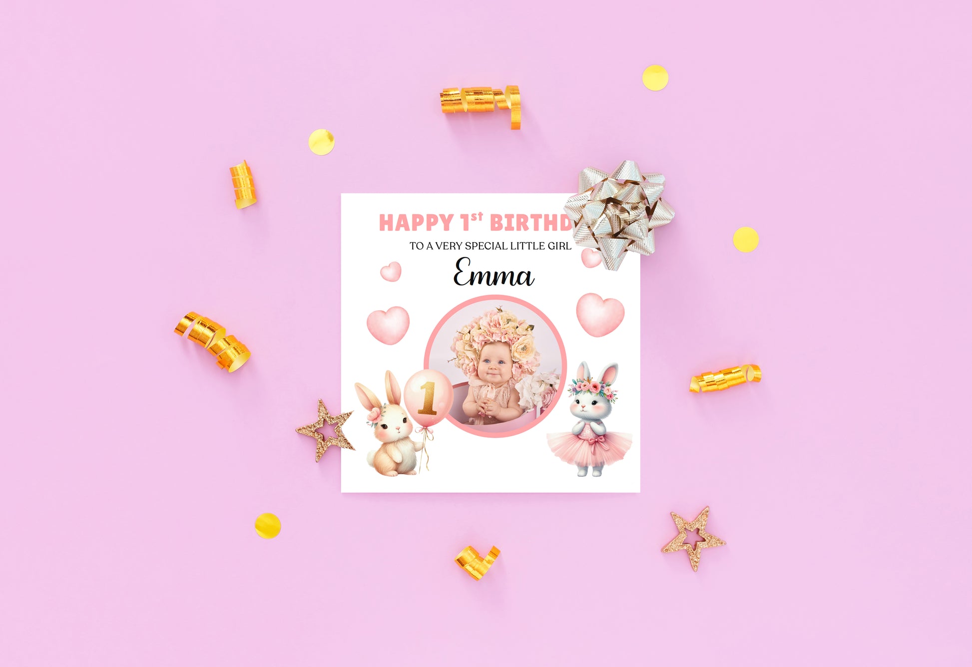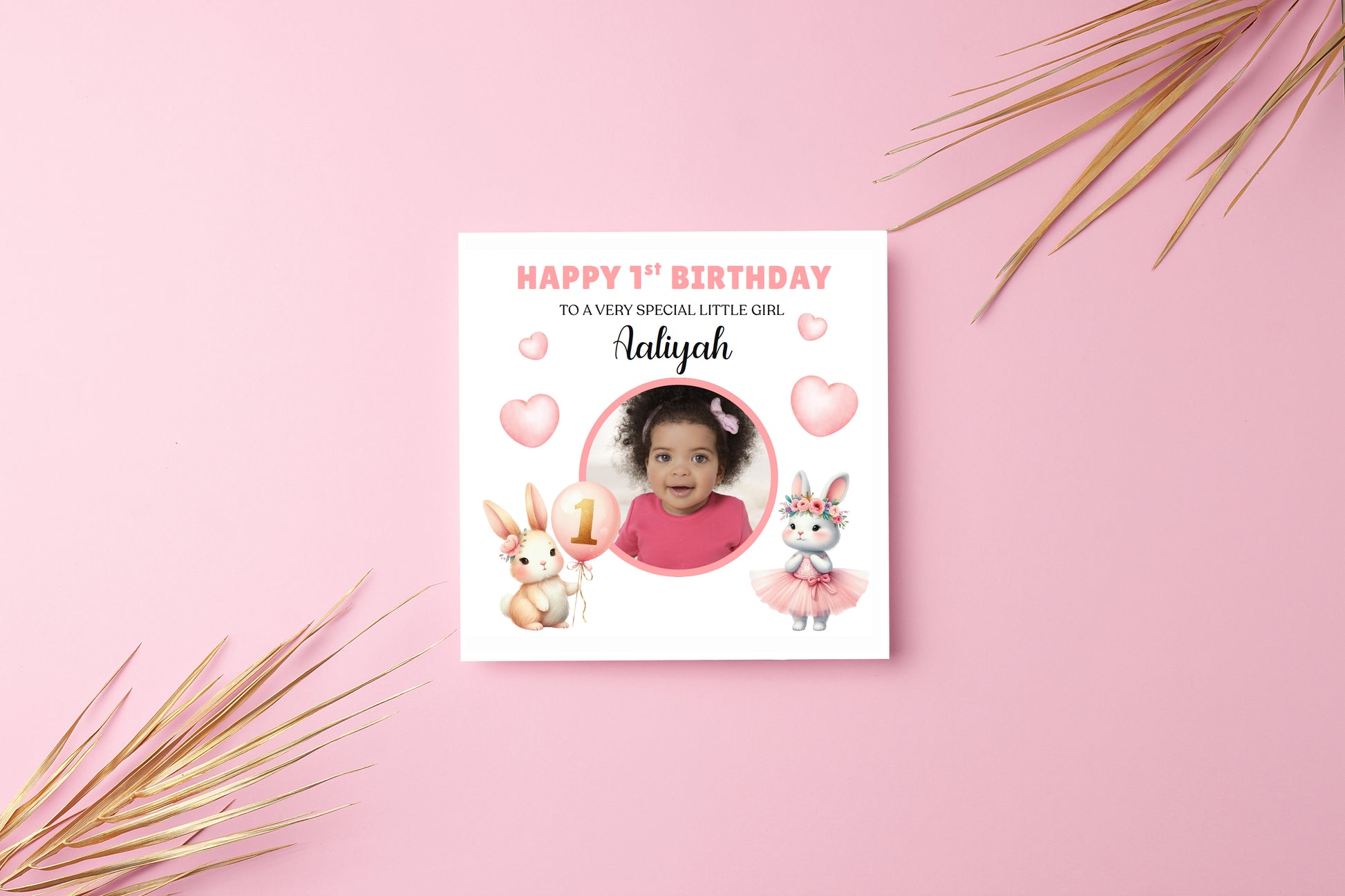 Celebrate your little one’s special milestone with this adorable personalised 1st birthday card for a baby girl. Featuring a cute bunny design, soft pink hearts, and a custom photo of your child, this keepsake card makes a perfect memory for her first birthday.