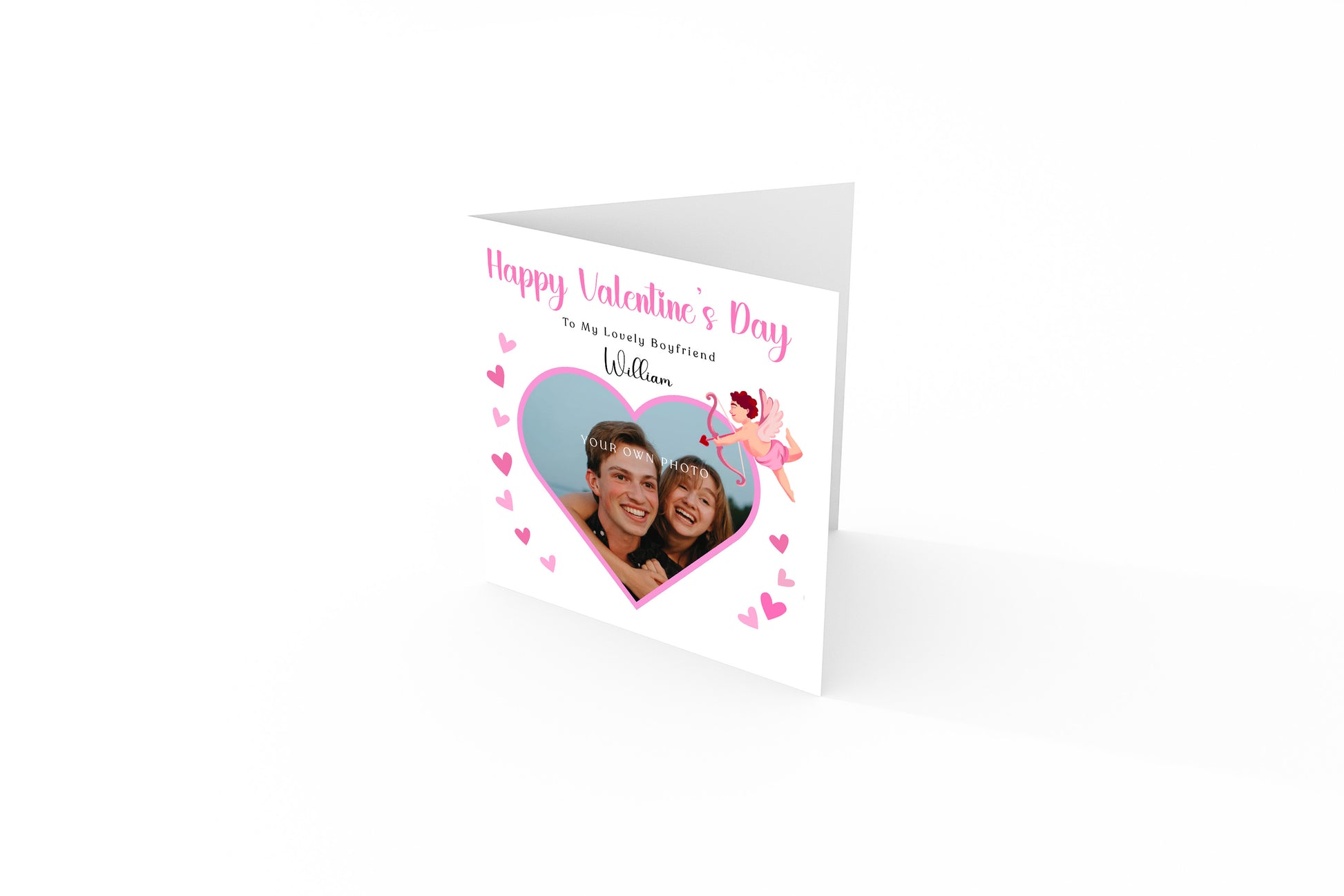 📸 The card can be customised with your own photo, name and a personalised front message, allowing you to tailor it for a boyfriend, girlfriend, husband, wife or loved one. The heart-shaped photo frame, soft pink tones and gentle cupid illustration create a romantic and timeless design.