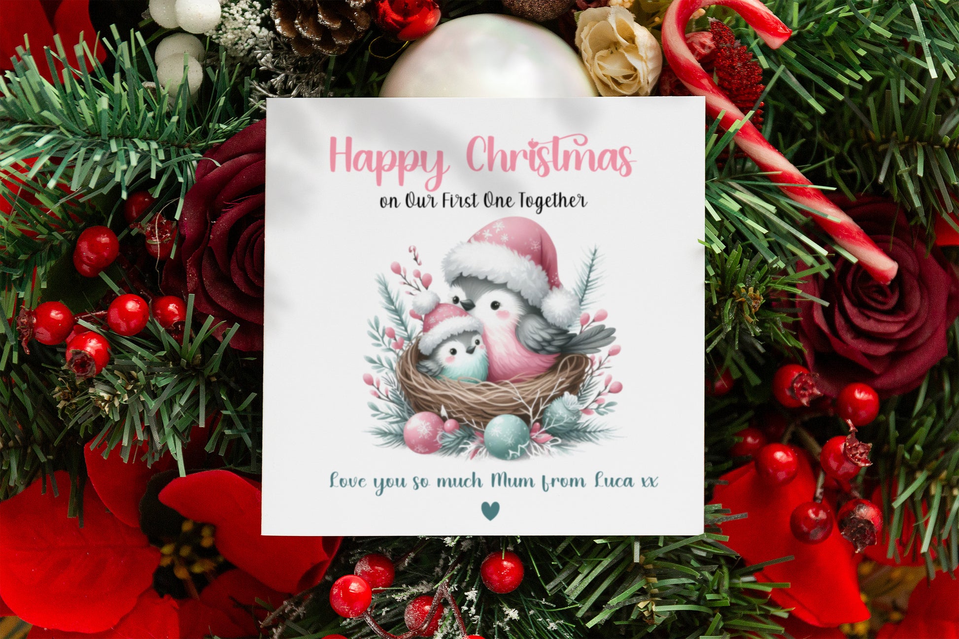 Make her first Christmas as a mum extra magical with this beautifully illustrated personalised greeting card. Featuring two adorable robins cuddled in a festive nest, this heartwarming design captures the love between a mother and her little one.