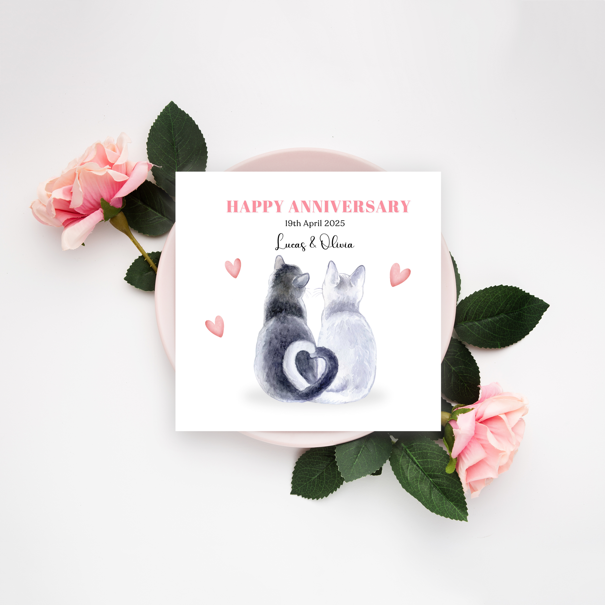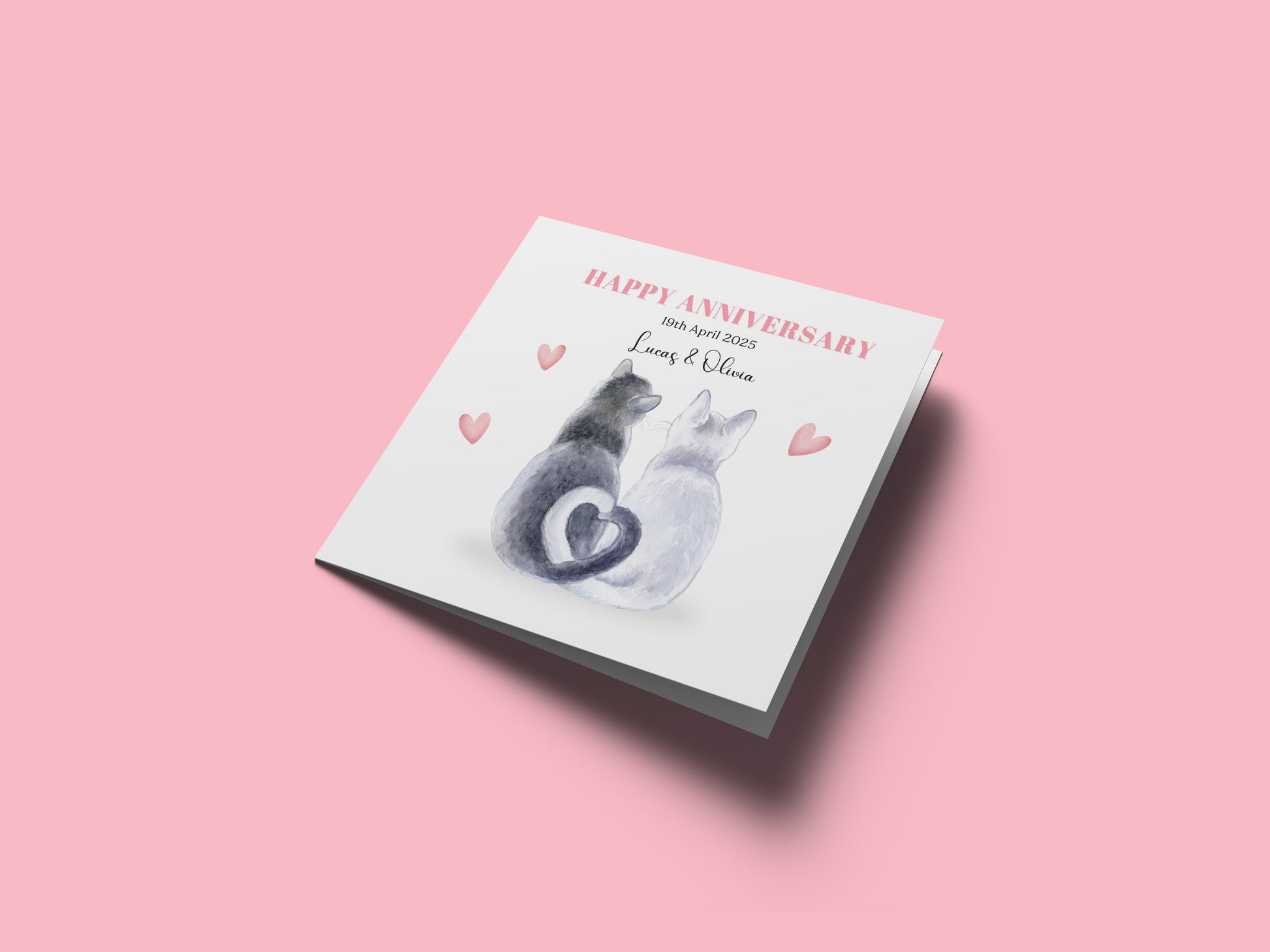 🩷 Celebrate love with this beautifully designed personalised anniversary card featuring an adorable cat couple forming a heart with their tails. Perfect for any couple who shares a love for romance and animals, this card can be customised with your names and special date to make it truly unique.