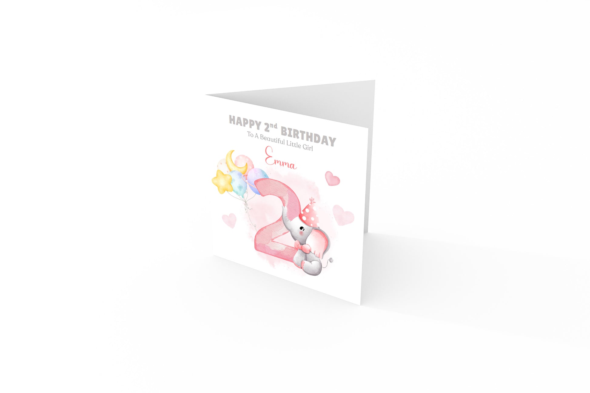 Personalised Two Years Old 2nd Birthday Card for Toddler Girl – Elephant Design with Custom Name and Message - Two-Year-Old Birthday Card for Daughter, Granddaughter, Niece – Pink Envelope Included