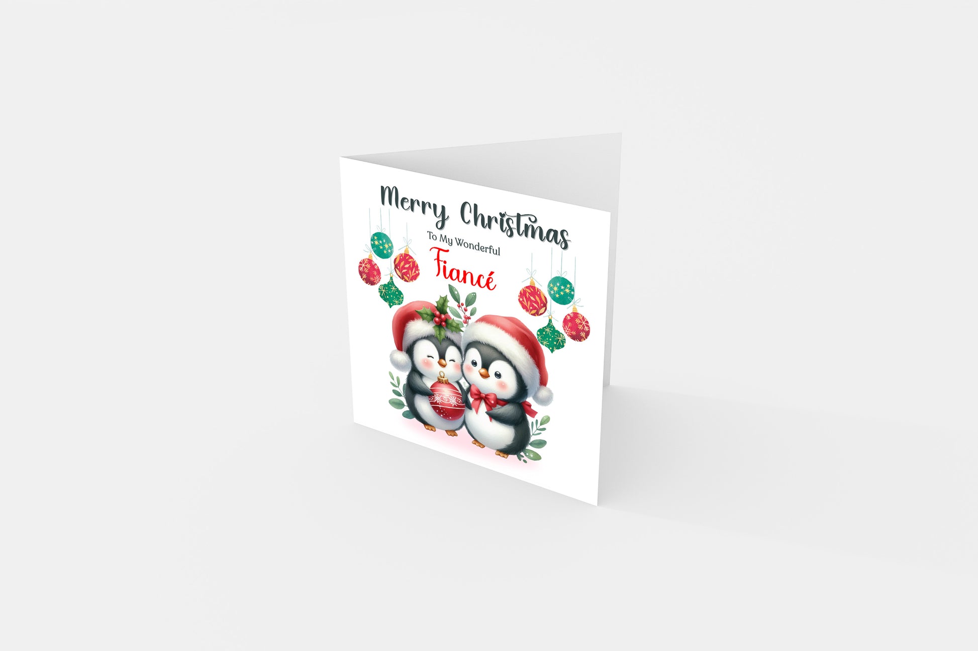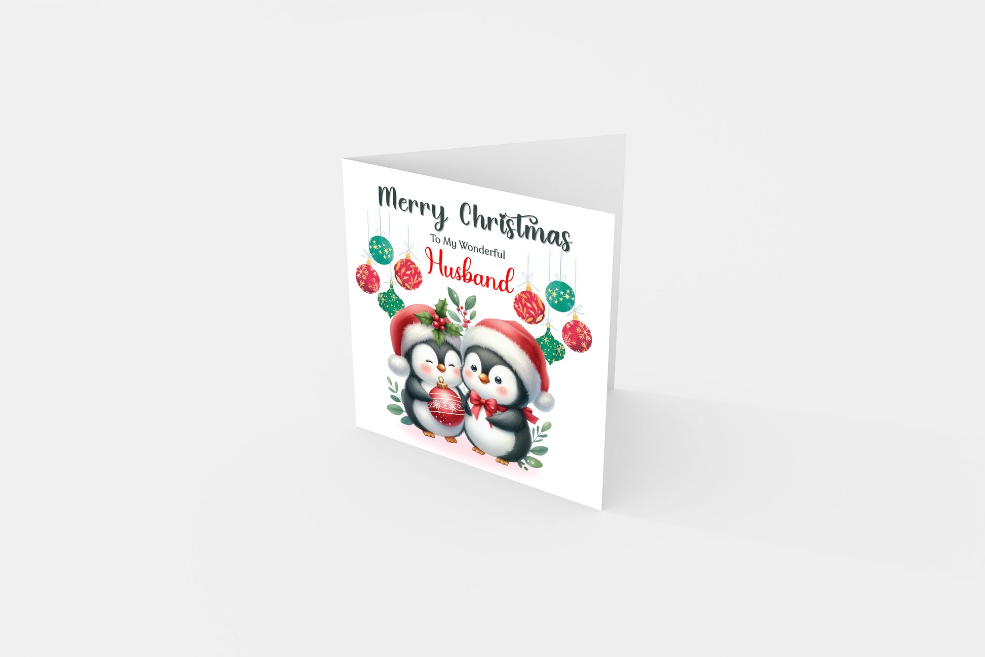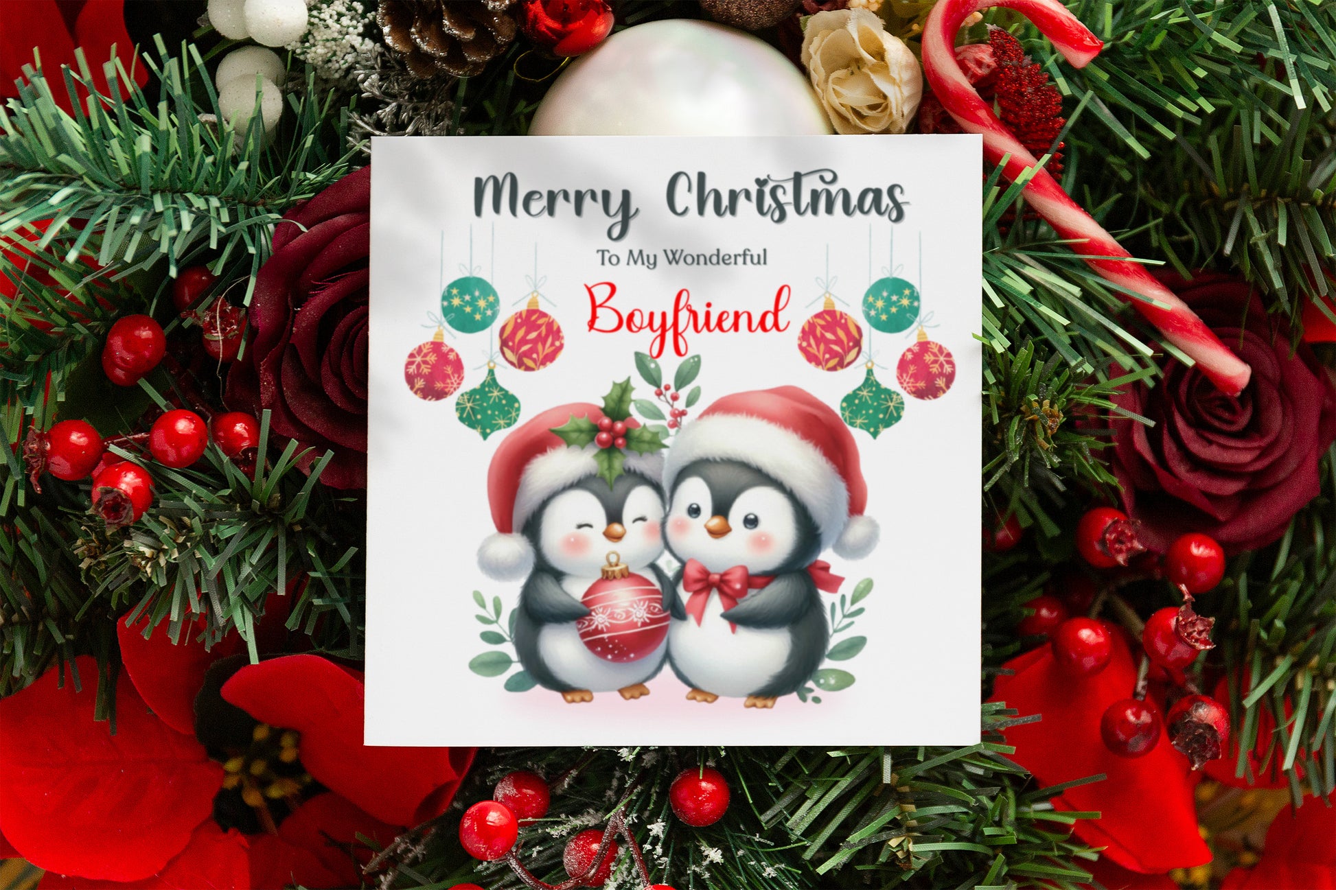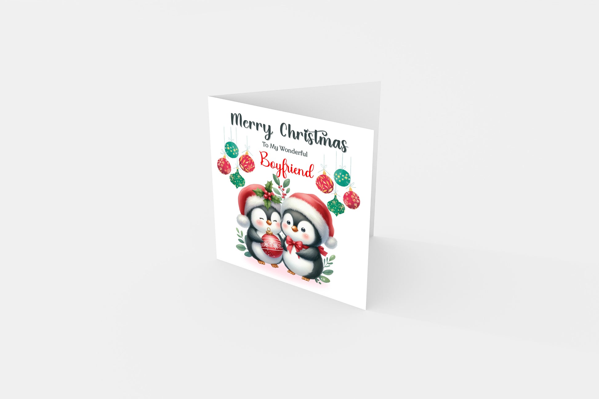 Cute Penguin Couple Merry Christmas Card – Penguins Xmas Card for Him or Her – 6 Options Available: Boyfriend, Girlfriend, Husband, Wife, Fiancé & Fiancée – Red Envelope Included