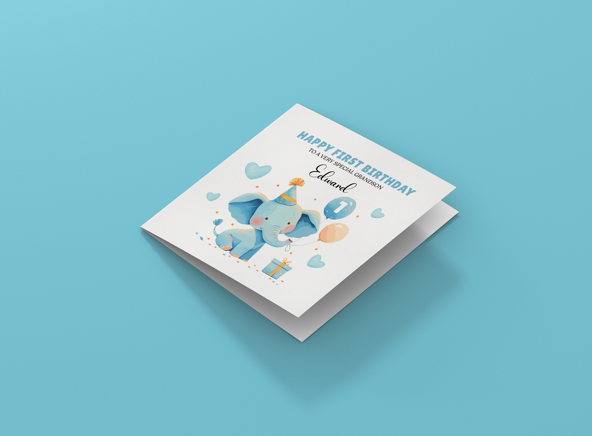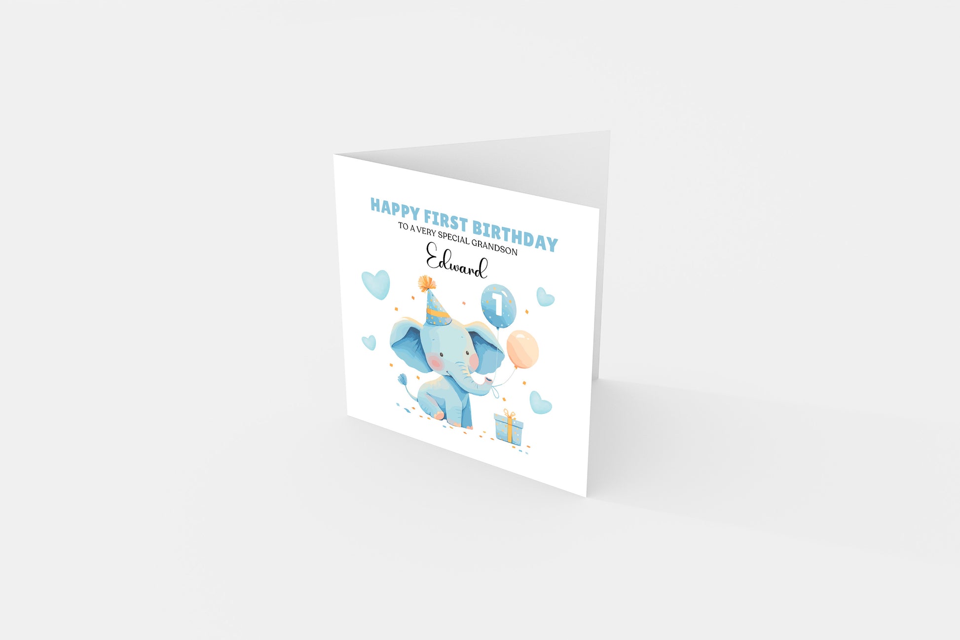 Celebrate a very special milestone with our beautifully designed personalised 1st birthday card for a baby boy. Featuring a charming baby elephant in a party hat, holding balloons and surrounded by love hearts, this adorable card is the perfect way to show your love and joy for your grandson on his big day.
